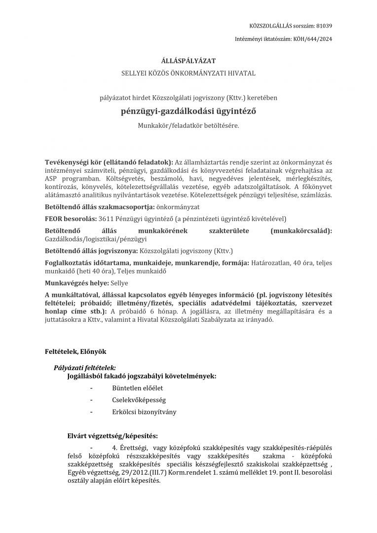 ÁLLÁSPÁLYÁZAT: PÉNZÜGYI - GAZDÁLKODÁSI ÜGYINTÉZŐ