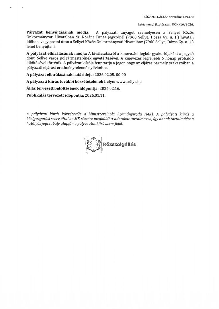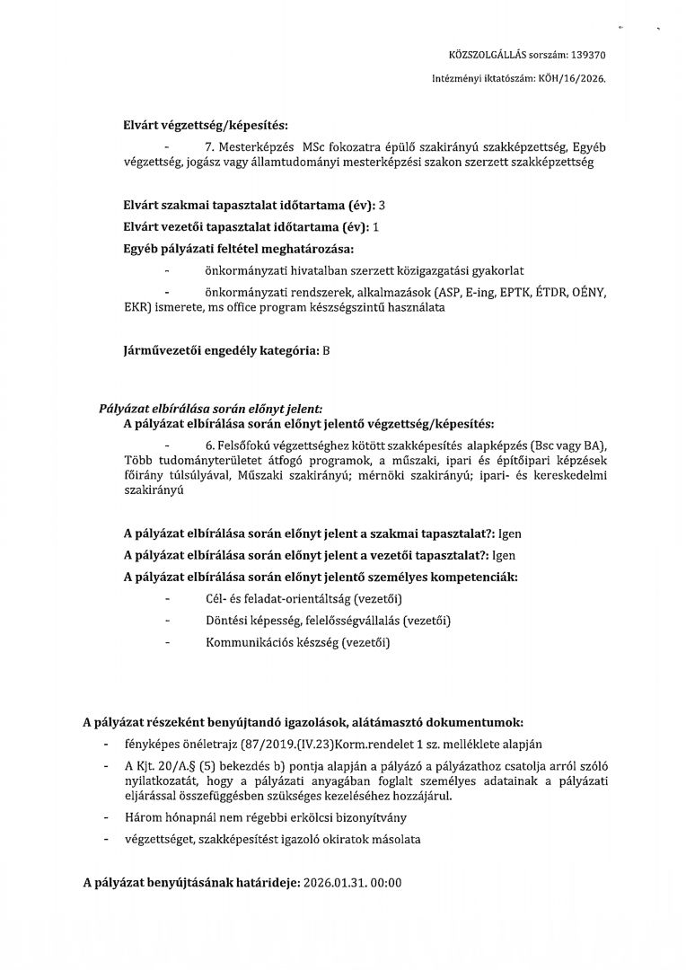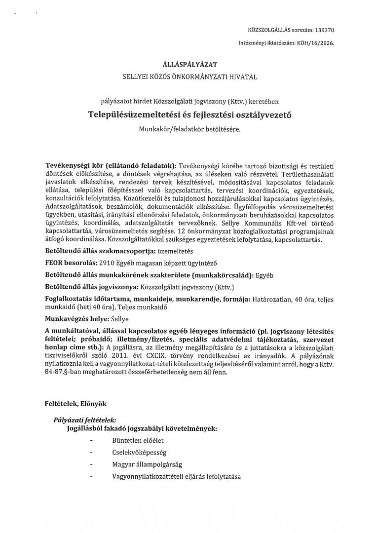 ÁLLÁSPÁLYÁZAT - TELEPÜLÉSÜZEMELTETÉSI ÉS FEJLESZTÉSI OSZTÁLYVEZETŐ