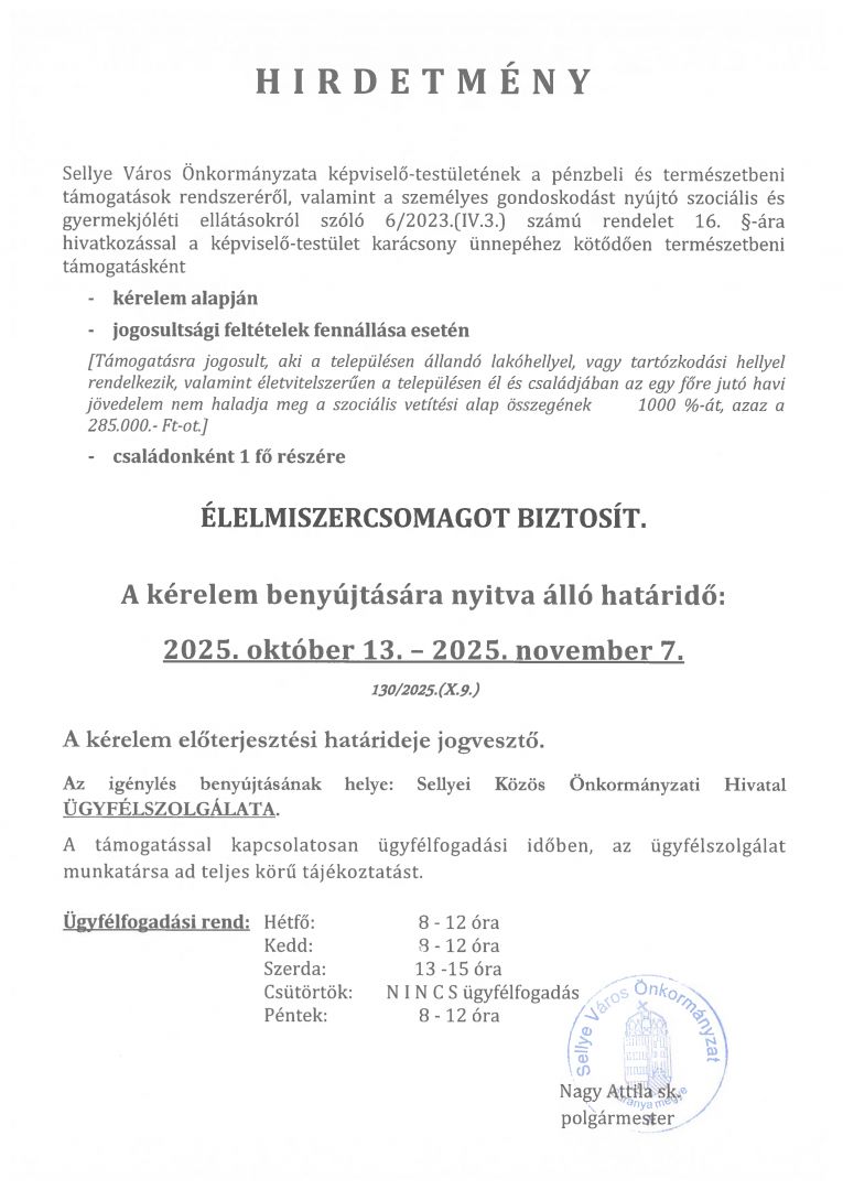 HIRDETMÉNY - ÉLELMISZERCSOMAG
