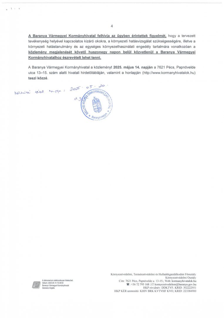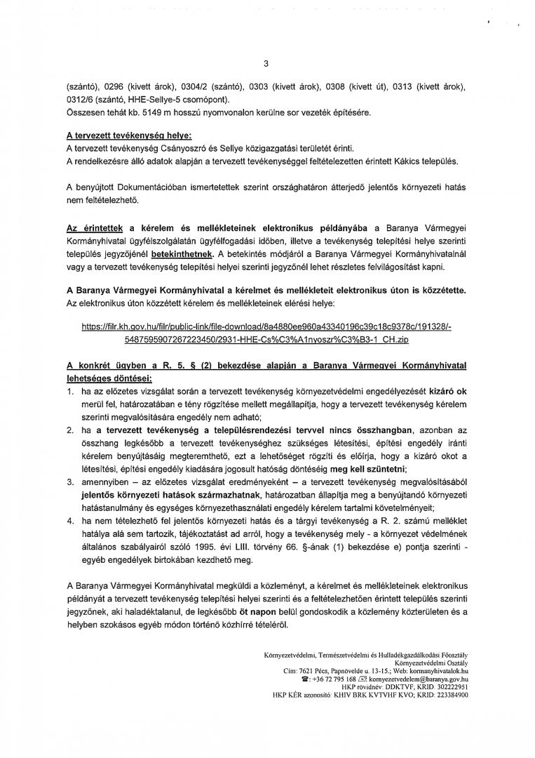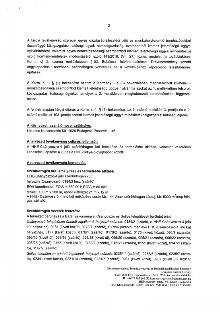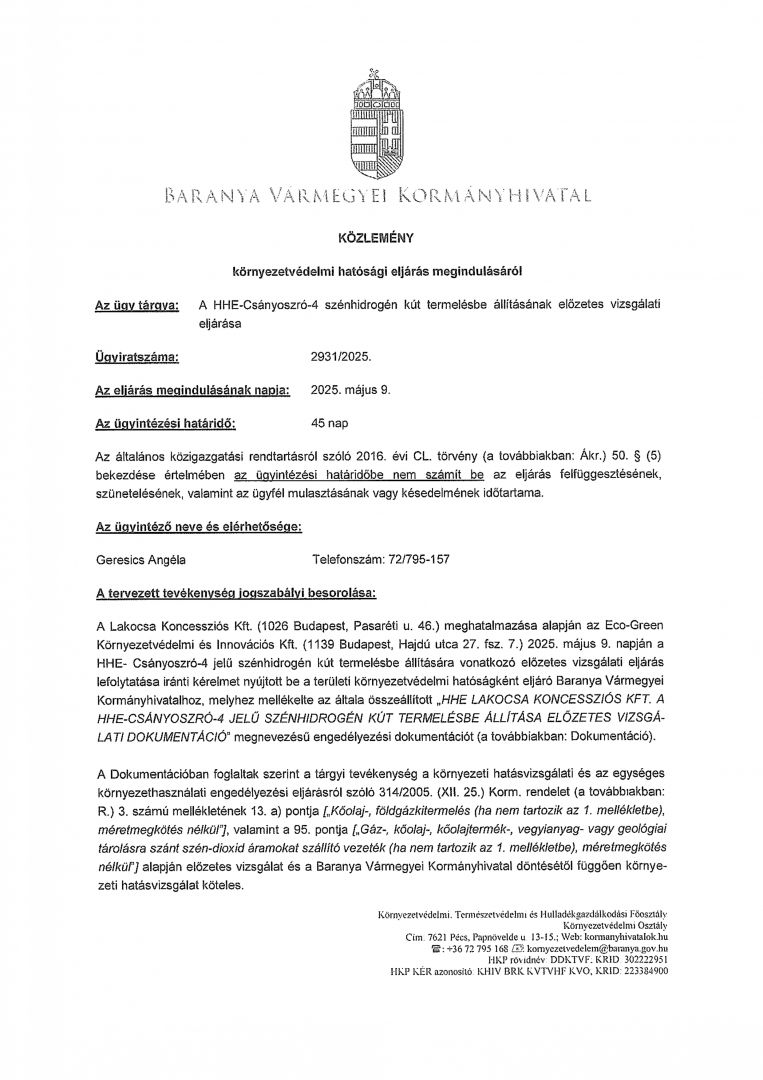 KÖZLEMÉNY KÖRNYEZETVÉDELMI HATÓSÁGI ELJÁRÁS MEGINDULÁSÁRÓL