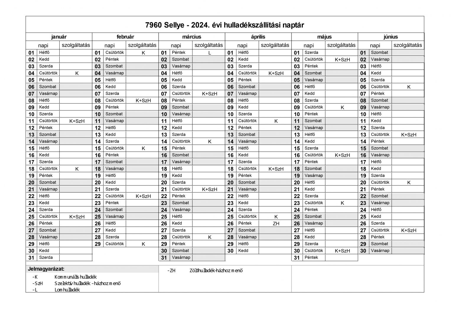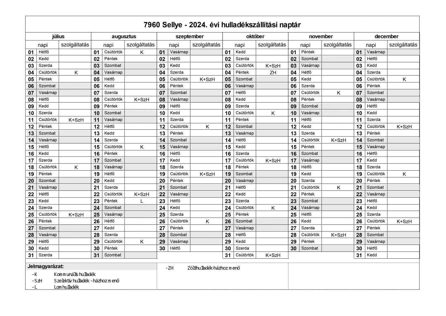 2024. ÉVI HULLADÉKSZÁLLÍTÁSI NAPTÁR