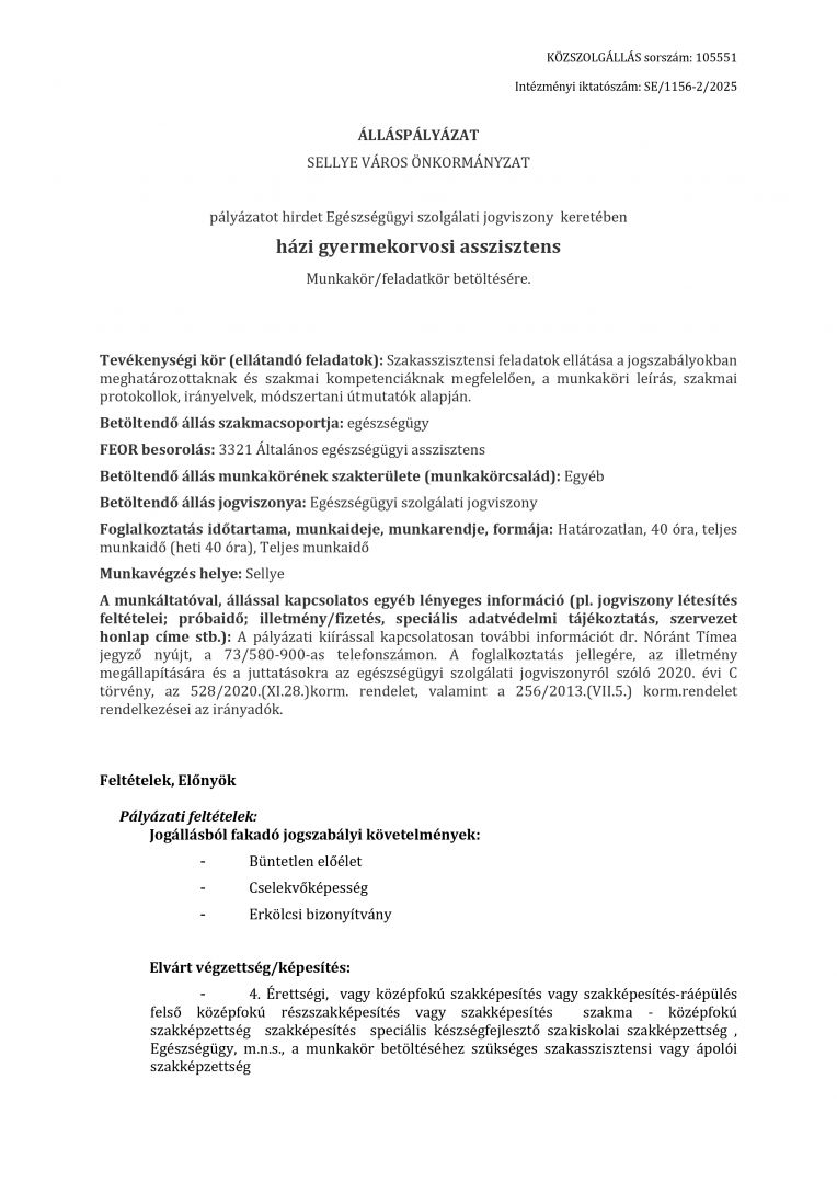 ÁLLÁSPÁLYÁZAT - HÁZI GYERMEKORVOSI ASSZISZTENS