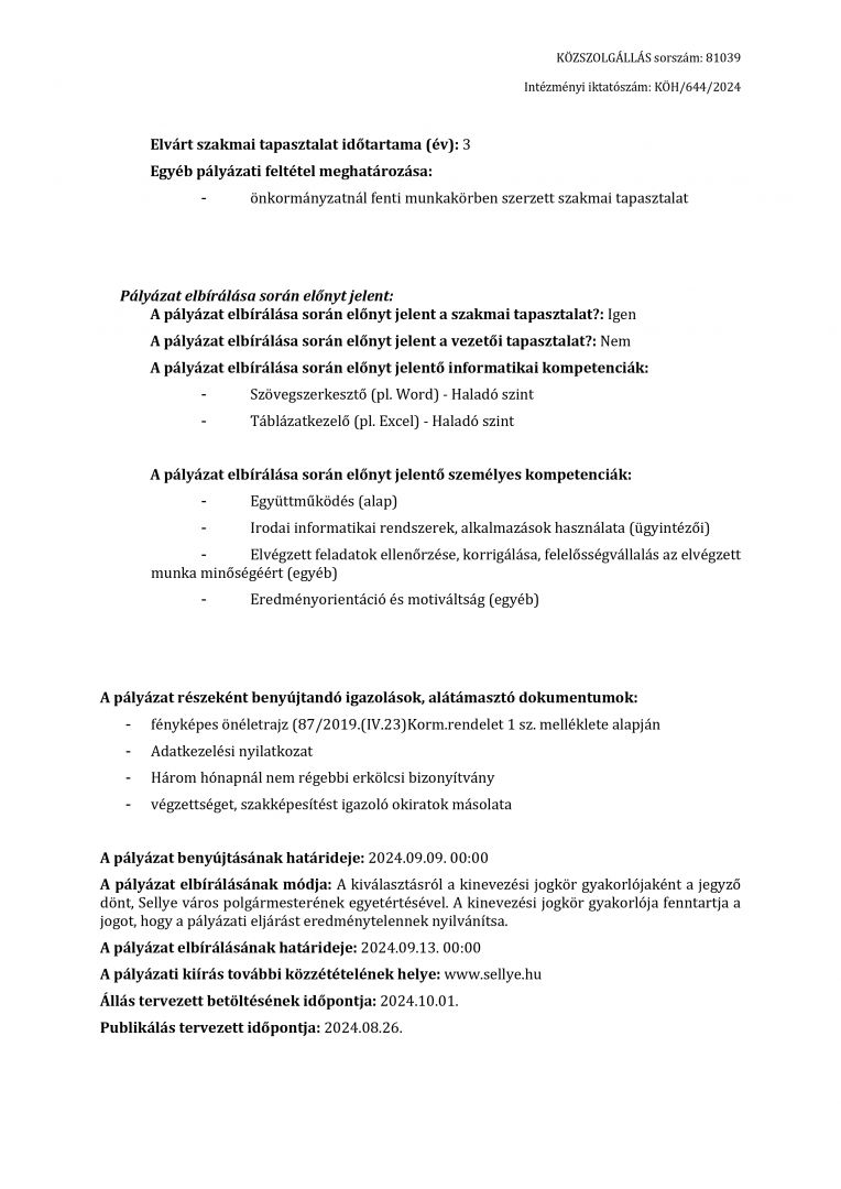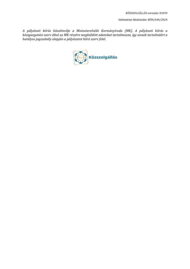 ÁLLÁSPÁLYÁZAT: PÉNZÜGYI - GAZDÁLKODÁSI ÜGYINTÉZŐ