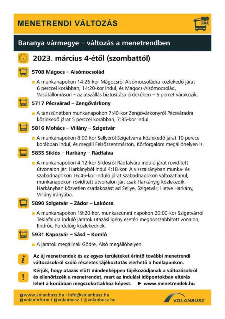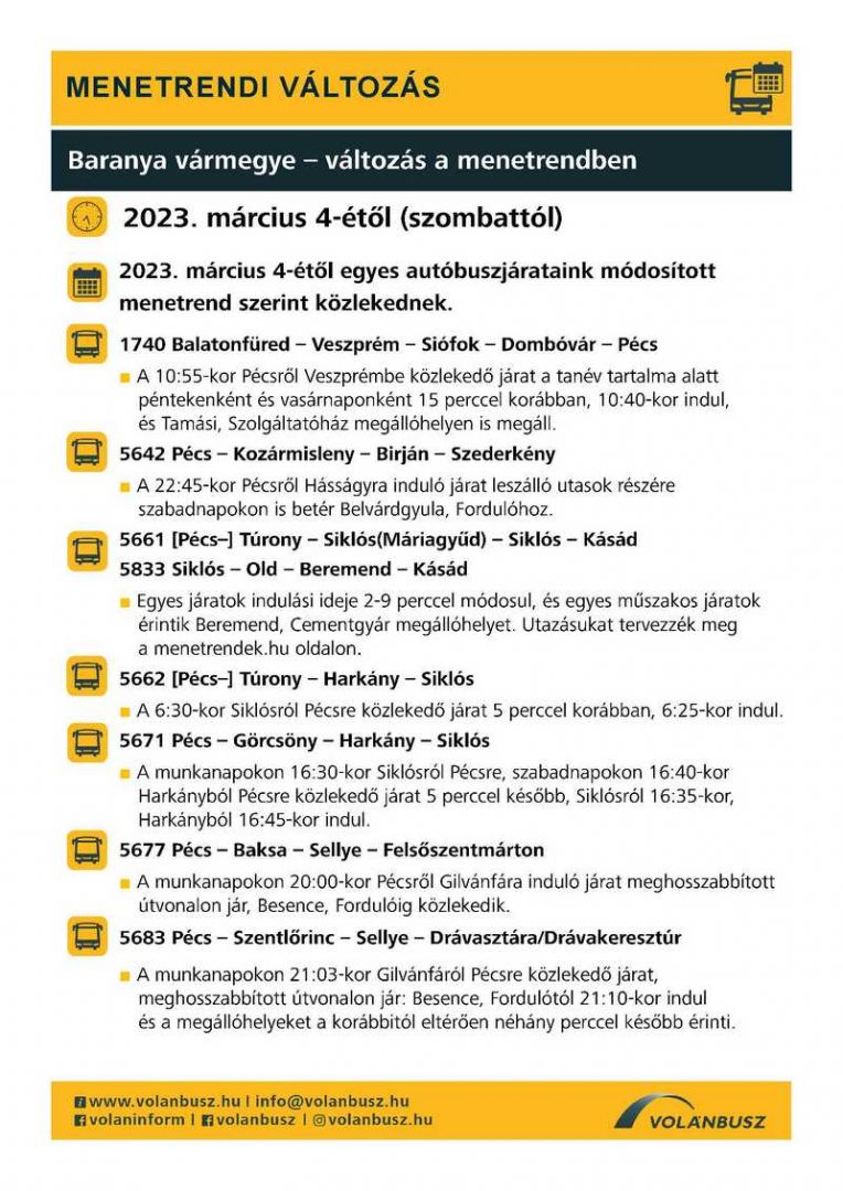 Tisztelt Lakosság! Tájékoztatjuk Önöket a Baranya vármegyében 2023. március 4-étől életbelépő autóbusz menetrend változásokról.