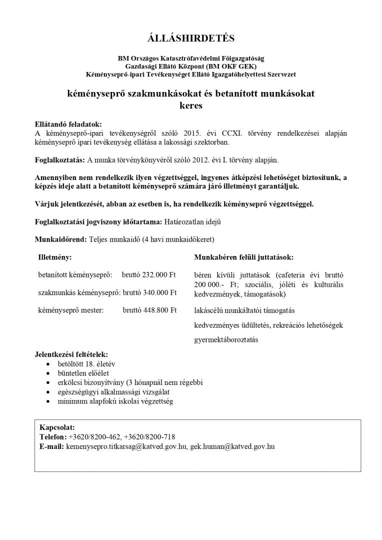 BM ORSZÁGOS KATASZTRÓFAVÉDELMI FŐIGAZGATÓSÁG HIRDETÉSE KÉMÉNYSEPRŐI ÁLLÁSRÓL