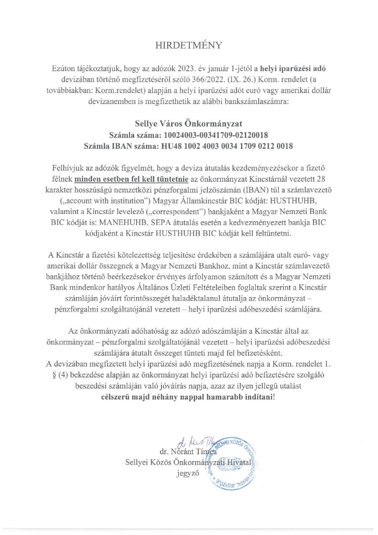 HIRDETMÉNY HELYI IPARŰZÉSI ADÓ DEVIZÁBAN TÖRTÉNŐ MEGFIZETÉSÉRŐL