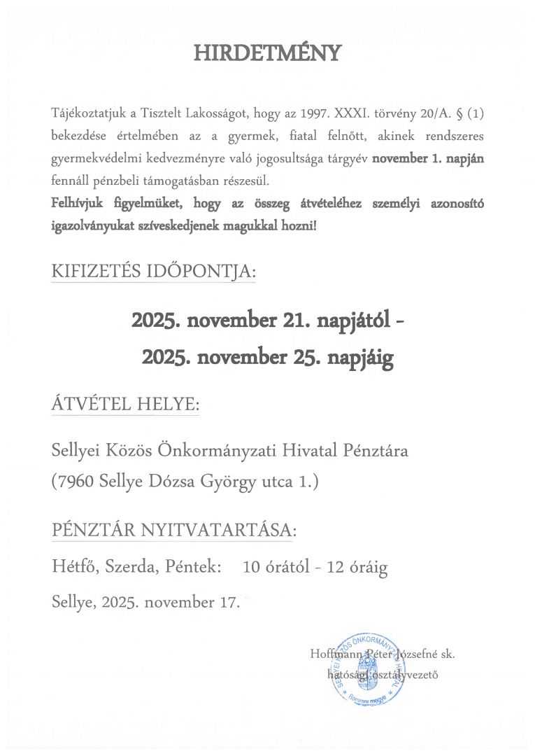 HIRDETMÉNY - PÉNZBELI TÁMOGATÁS