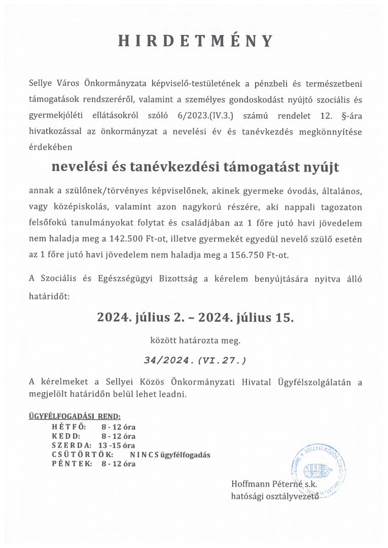 NEVELÉSI ÉS TANÉVKEZDÉSI TÁMOGATÁS