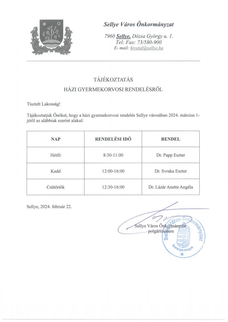 TÁJÉKOZTATÁS HÁZI GYERMEKORVOSI RENDELÉSRŐL