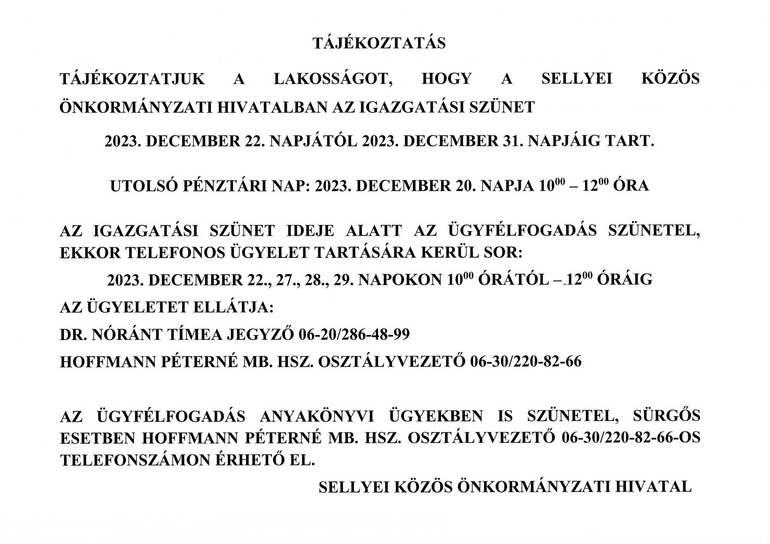 TÁJÉKOZTATÁS IGAZGATÁSI SZÜNETRŐL