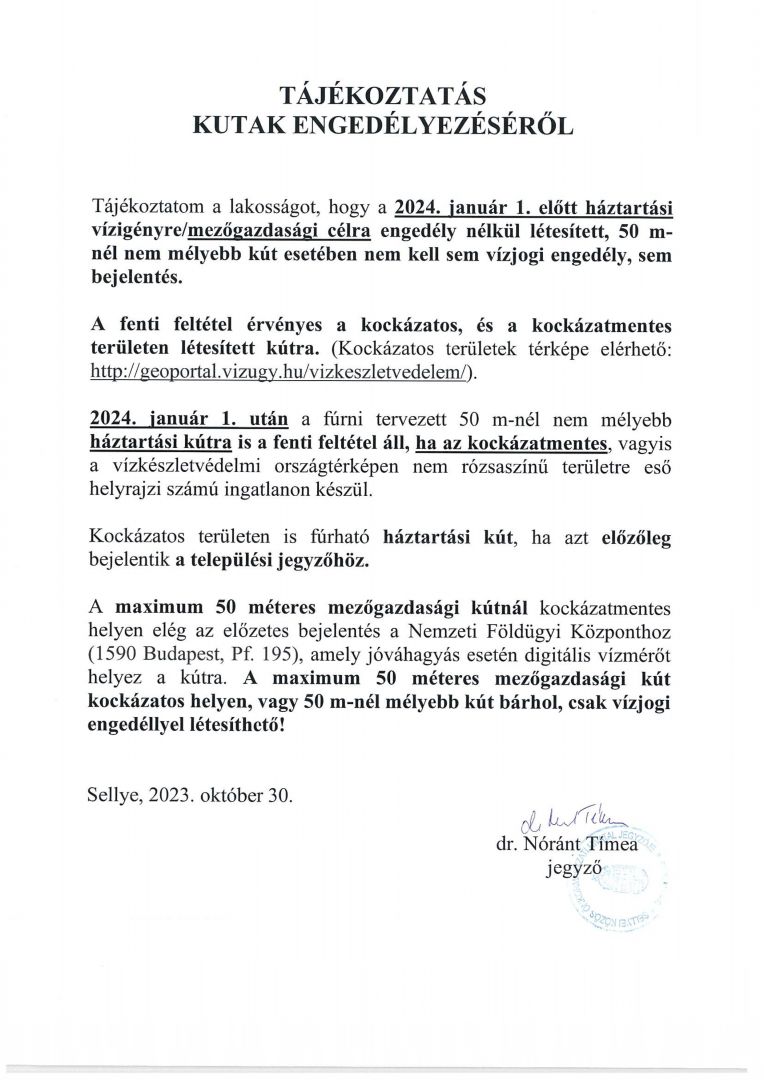 TÁJÉKOZTATÁS KUTAK ENGEDÉLYEZÉSÉRŐL