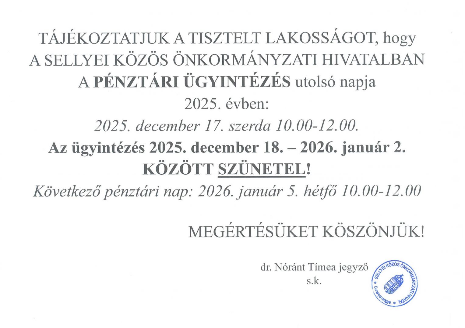 TÁJÉKOZTATÁS - PÉNZTÁRI ÜGYINTÉZÉS