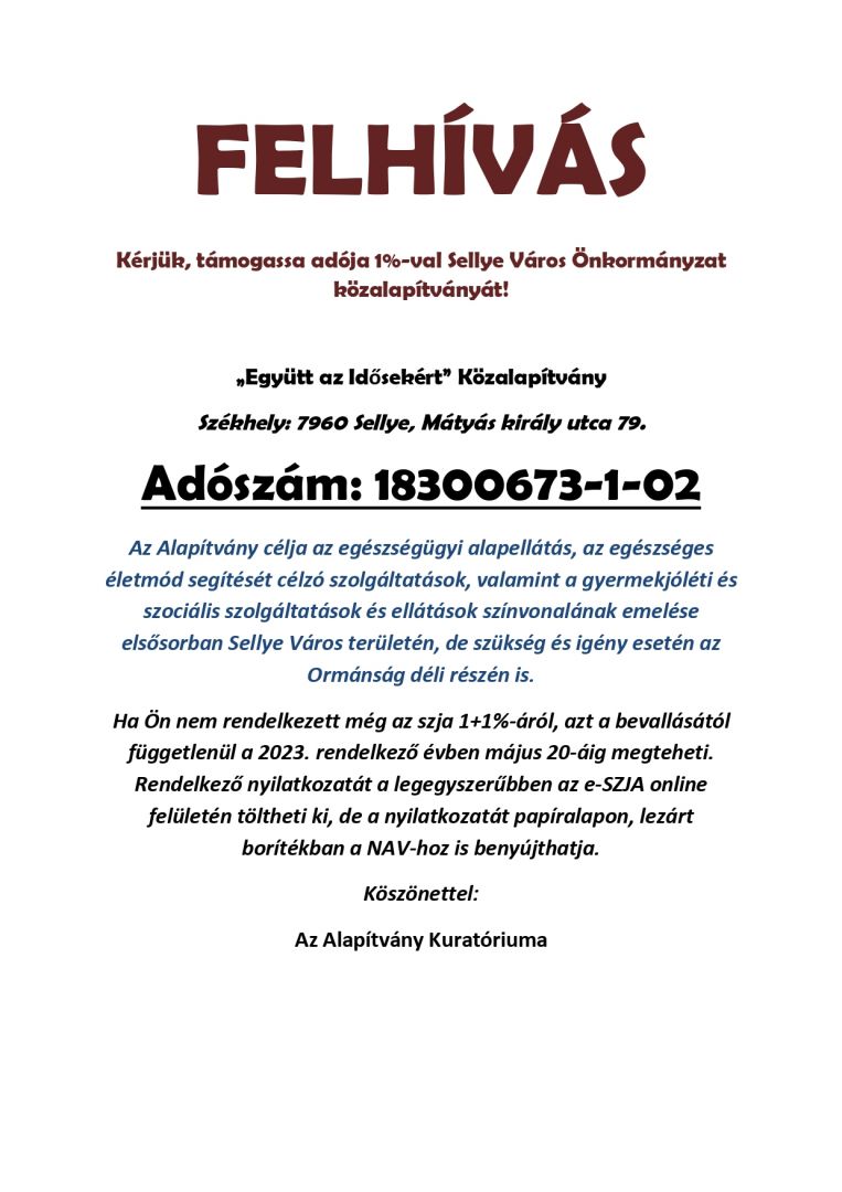 TÁMOGASSA ADÓJA 1%-VAL SELLYE VÁROS ÖNKORMÁNYZAT KÖZALAPÍTVÁNYÁT!